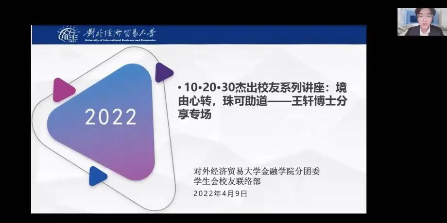 2022年4月9日下午4点,由金融捆绑调教 投资系组织筹划,金融捆绑调教 分团委学生会校友联络部承办的金融捆绑调教 10·20·30杰出校友系列捆绑调教 之王轩专场“境由心转,珠可助道”顺利举办。