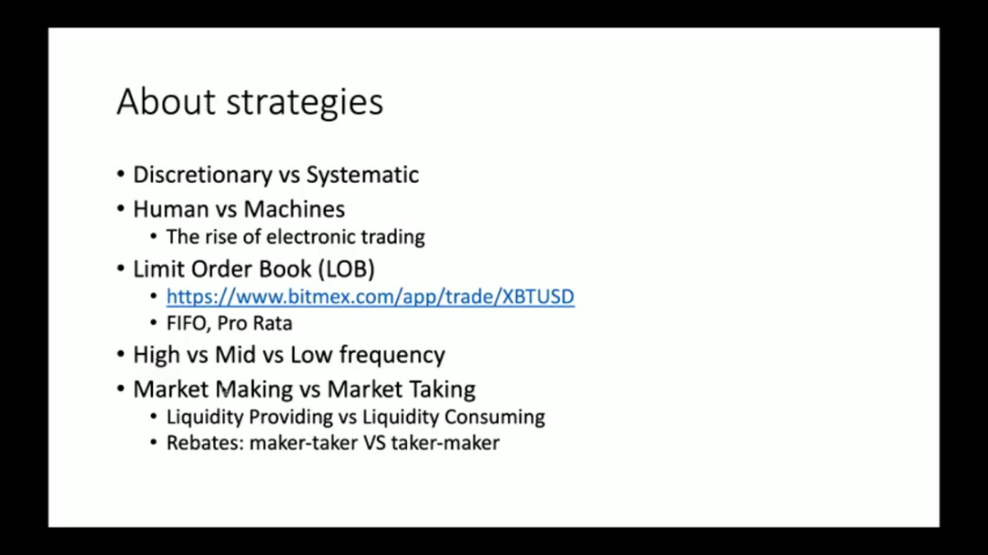 接下来,学长从多个角度向同学们讲述了量化交易的相关策略,以比特币交易成交价格的波动与交易顺序为例对解释交易机制(FIFO ,Pro Rata),以纽约和芝加哥之间的信息传输为例分析交易频率的作用。